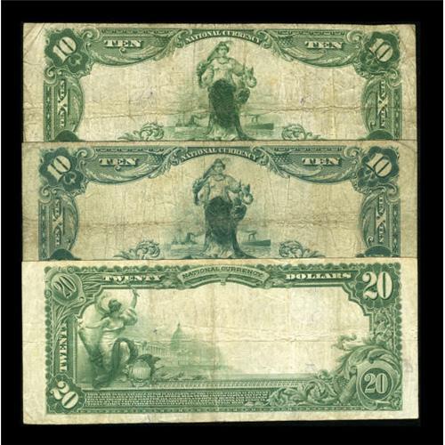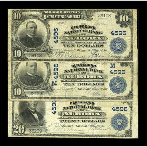 <B>Aurora, IL</B></I> - $10 1902 Plain Back Fr. 627 <B>The Old Second NB</B></I> Ch. # (M)4596<BR><B>Aurora, IL</B></I> - $10 1902 Plain Back Fr. 627 <B>The Old Second NB</B></I> Ch. # 4596<BR><B>Aurora, IL</B></I> - $20 1902 Plain Back Fr. 653 <B>The Old Second NB</B></I> Ch. # 4596<BR> The $20 PB grades <B>VF</B></I>, while the two $10 notes grade <B>Fine</B></I>, with one displaying pinholes.<BR><BR><b>Shipping:</b> Coins & Currency (<a target="_blank" href="http://www.heritageauctions.com/common/shipping.php">view shipping information</a>)