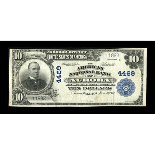 <B>Aurora, IL</B></I> - $10 1902 Plain Back Fr. 632 <B>The American NB</B></I> Ch. # 4469<BR> A small hole is noticed at top center on this crisp <B>Very Fine</B></I> example from a bank which had to change its name due to growing anti-German sentiment during WWI. <BR><BR><b>Shipping:</b> Coins & Currency (<a target="_blank" href="http://www.heritageauctions.com/common/shipping.php">view shipping information</a>)