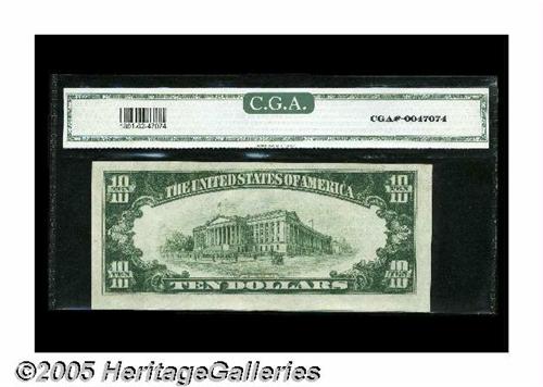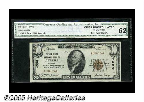<B>Aurora, IL</B></I> - $10 1929 Ty. 1 <B>The Old Second NB</B></I> Ch. # 4596<BR>A <B>CGA Crisp Uncirculated 62</B></I> that appears to have been graded thus due solely to centering issues.