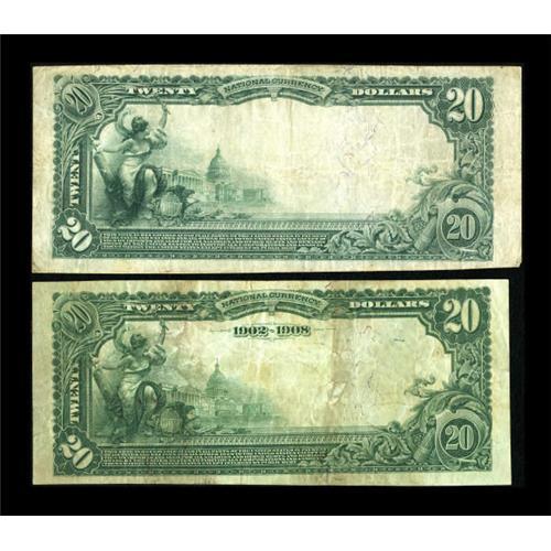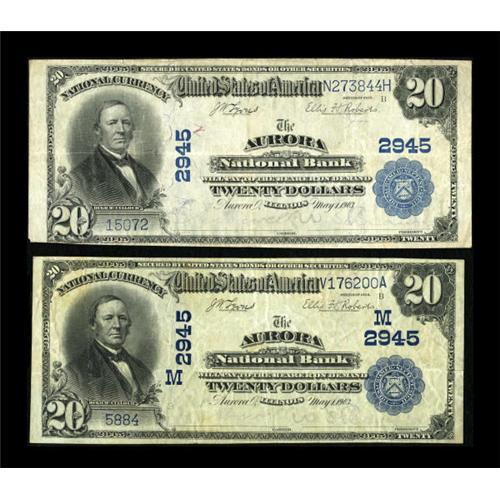 <B>Aurora, IL</B></I> - $20 1902 Date Back Fr. 642 <B>The Aurora NB</B></I> Ch. # (M)2945<BR><B>Aurora, IL</B></I> - $20 1902 Plain Back Fr. 658 <B>The Aurora NB</B></I> Ch. # 2945<BR> A couple of edge nicks are seen on the PB $20, while the $20 DB has a touch of staining visible. Both notes grade <B>Very Fine</B></I>.<BR><BR><b>Shipping:</b> Coins & Currency (<a target="_blank" href="http://www.heritageauctions.com/common/shipping.php">view shipping information</a>)