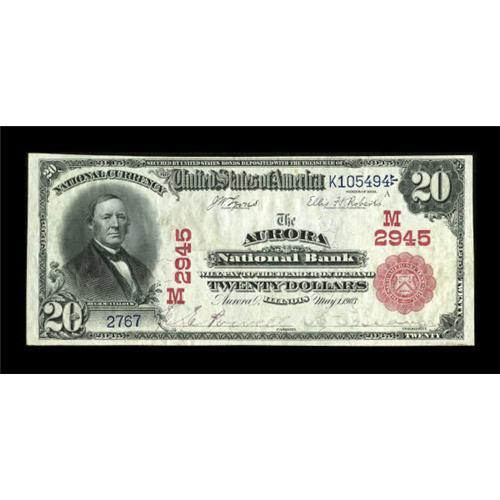 <B>Aurora, IL</B></I> - $20 1902 Red Seal Fr. 639 <B>The Aurora NB</B></I> Ch. # (M)2945<BR> An attractive Red Seal twenty that has been off the market since our consignor obtained it in a Hickman-Oakes sale in 1985. Bright <B>Extremely Fine.</B></I><BR><BR><b>Shipping:</b> Coins & Currency (<a target="_blank" href="http://www.heritageauctions.com/common/shipping.php">view shipping information</a>)