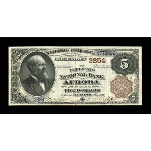 <B>Aurora, IL</B></I> - $5 1882 Brown Back Fr. 470 <B>The Merchants NB</B></I> Ch. # 3854<BR> While this hardly qualifies as a rare bank due to all of the high denomination Third Charters known, just two Brown Backs are reported from here, with this the superior of the two by a huge margin. Pen signed <B>Very Fine-Extremely Fine, </B></I>a real peach of a note. <BR><BR><b>Shipping:</b> Coins & Currency (<a target="_blank" href="http://www.heritageauctions.com/common/shipping.php">view shipping information</a>)