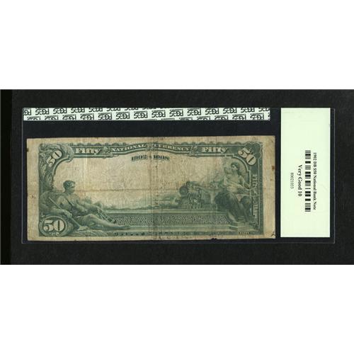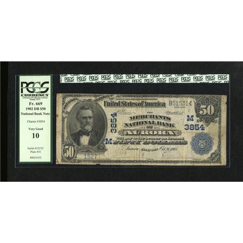 <B>Aurora, IL</B></I> - $50 1902 Date Back Fr. 669 <B>The Merchants NB</B></I> Ch. # (M)3854<BR>The purple signatures have partially faded on this example with the signature of cashier and future bank president F.J. Knight still legible. <B>PCGS Very Good 10.</B></I><BR><BR><b>Shipping:</b> Coins & Currency (<a target="_blank" href="http://www.heritageauctions.com/common/shipping.php">view shipping information</a>)