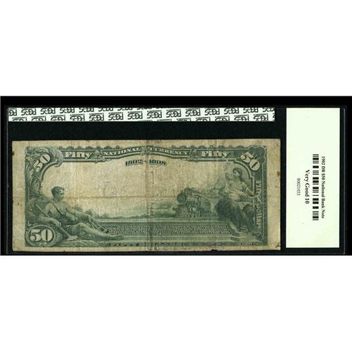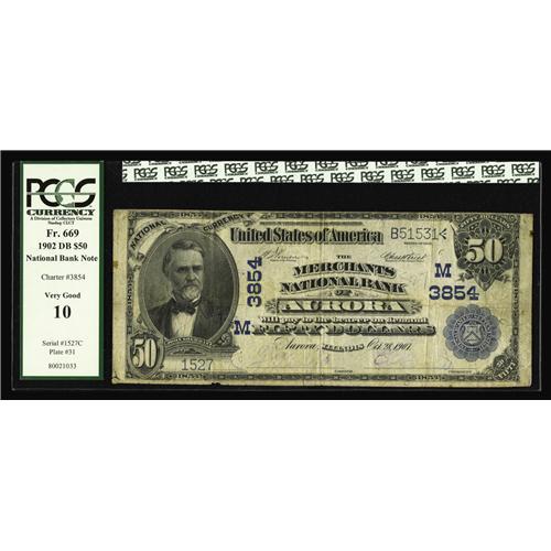 <B>Aurora, IL</B></I> - $50 1902 Date Back Fr. 669 <B>The Merchants NB</B></I> Ch. # (M)3854<BR>The purple signatures have partially faded on this example with the signature of cashier and future bank president F.J. Knight still legible. <B>PCGS Very Good 10.</B></I>