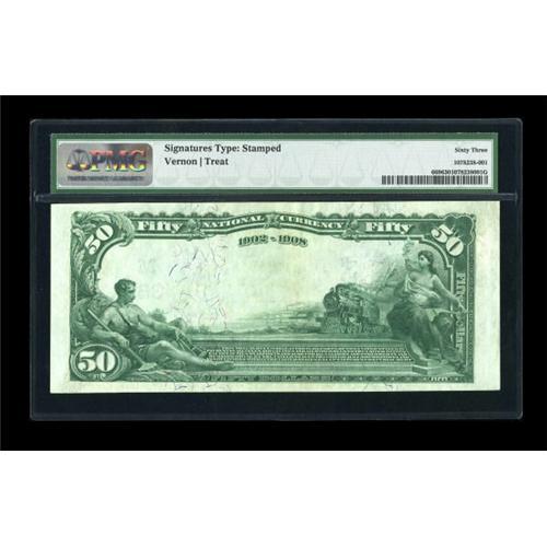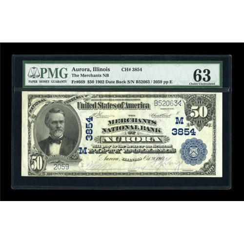 <B>Aurora, IL </B></I>- $50 1902 Date Back Fr. 669 <B>The Merchants NB</B></I> Ch. # (M)3854<B></B></I><BR> Starting with the Series of 1902, this bank only issued $50s and $100s. Rich inks, stellar embossing and bright white paper are merits of this note. The purple signatures of W.G. Nicholson and F.J. Knight have faded, but are still legible. <B>PMG Choice Uncirculated 63.</B></I><BR><BR><b>Shipping:</b> Coins & Currency (<a target="_blank" href="http://www.heritageauctions.com/common/shipping.php">view shipping information</a>)
