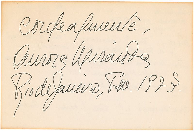 Actress (1915–2005) and sister of Carmen Miranda, best remembered for her dance routine with Donald Duck and Jose Carioca in the Disney film The Three Caballeros. Very scarce ink signature, “Cordialmente, Aurora Miranda, Rio de Janeiro, 1973,” on an off-white 6 x 4 card. In fine condition, with some mild edge toning.