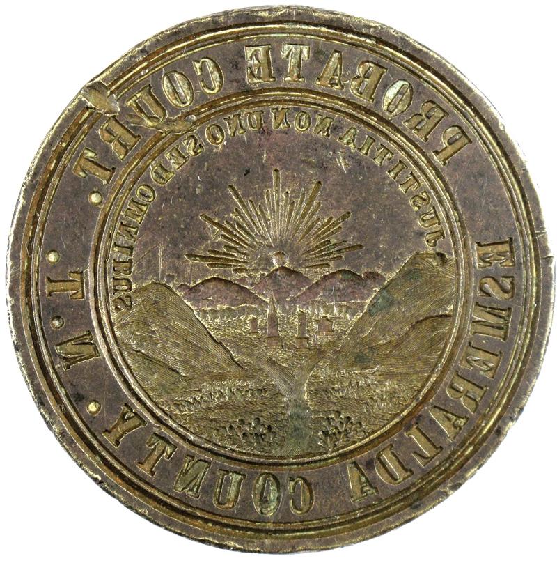 Embossing seal from the Probate Court in Esmeralda County, Nevada Territory. Net weight 8oz. The circumference is 5.495 inches and has a diameter of 1.75 inches and a height of 1/2”. There are two lines of text. The first line is circumferential “Probate Court Esmeralda County.” The second line is also circumferential and is written in Latin underneath the first line. In the center is a vignette of a sun rising over mountains which surround a picturesque valley. Brass material, Good condition.