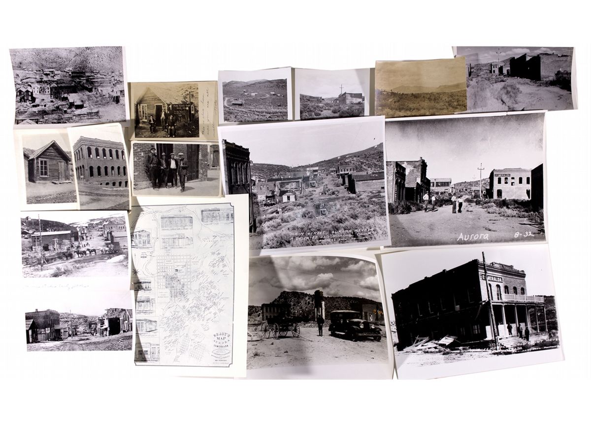 Lot of 15 black and white photos and one illustrated map of Aurora. Most of them were taken in the 1930s, when it was already a ghost town. Buildings shown in the photos include the Mineral County courthouse and a couple of Main Street shots. There are also a few street scenes from the early 1900s, with some of the residents in one of the shots. There are also 2 photos of the cabin that, according to the writing on the border of the print, is where Mark Twain lived for a brief period and described in his book "Roughing It." There is also an 8" x 11" copy of Brady`s Map of Aurora and Esmeralda with identifying landmarks and buildings noted. All photos are in good condition and very sharp. - Maish Collection -58893