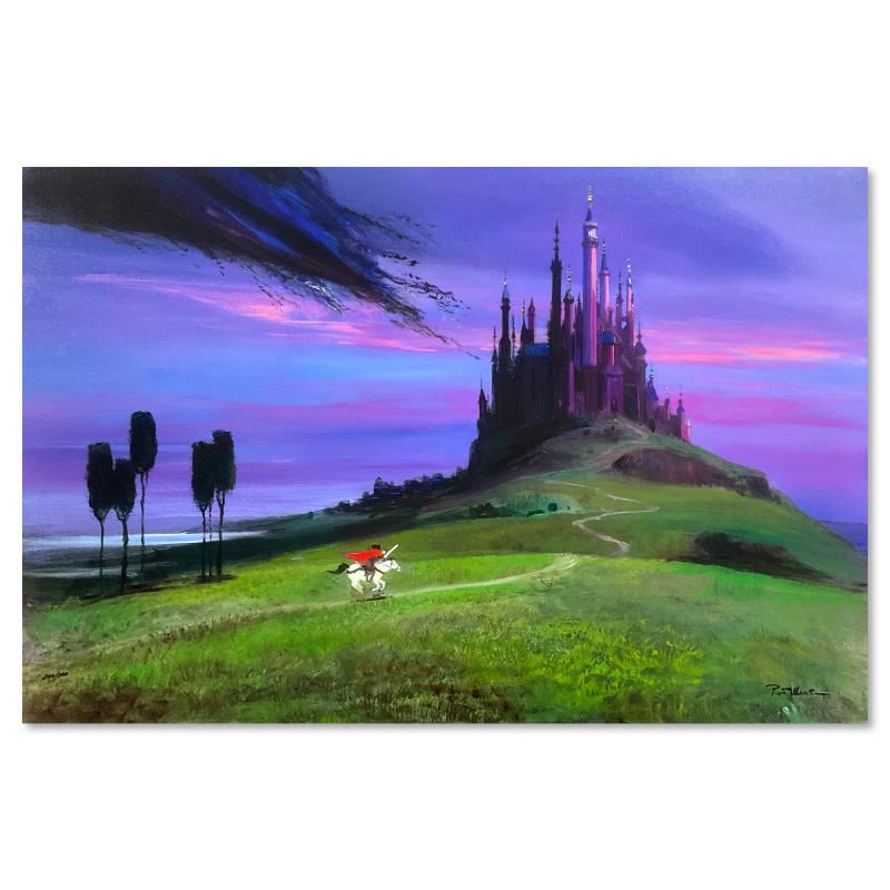 "Aurora's Rescue" is a limited edition giclee on stretched canvas, numbered 206/300 and hand signed by Peter Ellenshaw (1913-2007). This piece is licensed by Disney Fine Art. Includes Letter of Authenticity. Measures approx. 36" x 24" (image). There are light scratches on the top-right corner and a faint scratch through the signature.