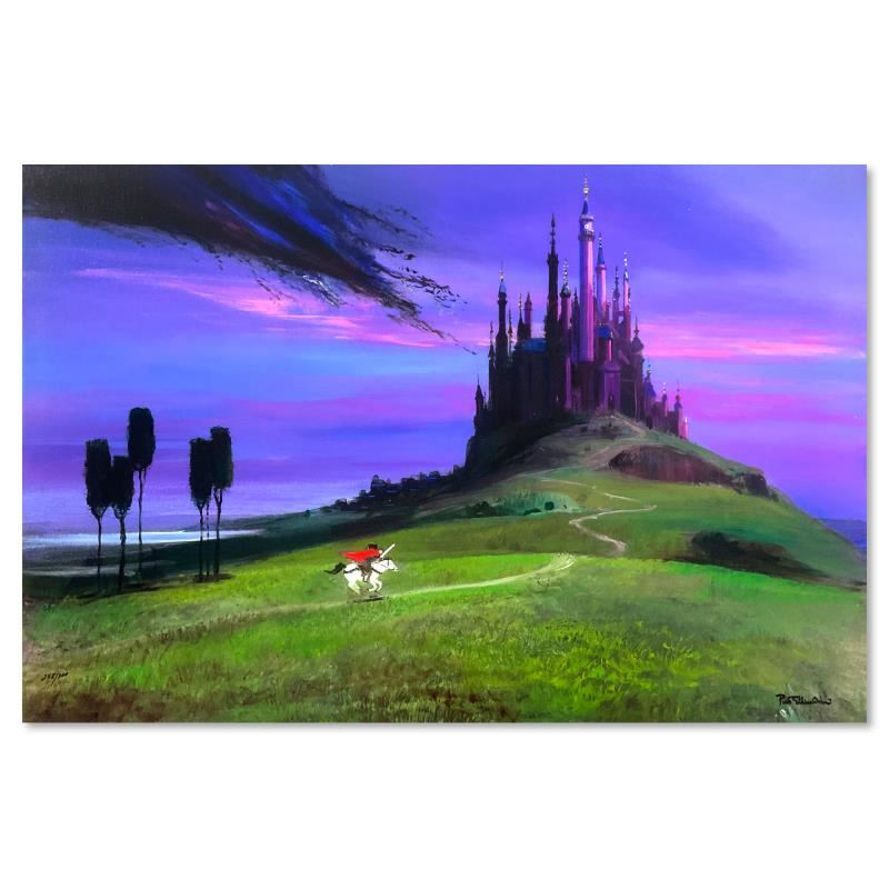 "Aurora's Rescue" is a limited edition giclee on stretched canvas, numbered 258/300 and hand signed by Peter Ellenshaw (1913-2007). This piece is licensed by Disney Fine Art. Includes Letter of Authenticity. Measures approx. 36" x 24" (image). There are faint diagonal creases on the right side of the image that are only noticeable from certain angles with close inspection; there are also faint scuffs through the top of the castle.