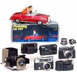 UdSSR, mit 2,8/52 und 2,8/3,5 cm sowie Universalsucher 2,8 bis 13,5 cm. - Fed 4 with 2 lenses and universal finder. (3/3) - Dabei: Kodak "Retina II F" (4/5), "Nikon Nice Touch 2" (3/3), "Canon Sprint" (3/2), "Minolta Autopak 600-X" (3/2) und "Minolta Mini 35" (Diaprojektor). - Sowie: "Photoing on car", the mystery action. - Batterie-Spielzeug mit wirklichkeitsgetreuem Armheben und Auslösen mit Blitzlicht, (2/-). - € 150/200 - (72/10)