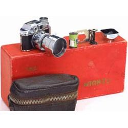 Toko, Japan, 14 x 14 mm, Hit-Typ-Kamera, Toko P. W., 4,5 Objektiv. Mit Mighty-Telephoto-Objektiv 2 x, Sonnenblende, Maske für das Filmfenster, Film, Ledertäschchen und Originalverpackung. Hit-type novelty camera. With telephoto lens, lens hood, mask, film, case and box. - (3/3) - € 200/250 - (127/1)