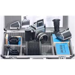 VEB Pentacon, Dresden, "Pentacon Six TL", mit Biometar 2,8/80, 4 Suchern plus Winkelsucher, Balgengerät, 4teiliger Zwischenringsatz, 10-mm-Zwischenring, Einstellschlitten, Adapter für Pentacon-Six-Objektive an M42-Kameras und 2 zusätzliche Einstellscheiben. In einigen Originalkartons, mit Bereitschaftstasche und großem Alukoffer. Hochwertiges Zubehör in aus- gezeichnetem Zustand. Large "Pentacon Six TL" outfit, of high quality. All parts in excellent condition. - (2/2) - € 400/500 - (129/8)