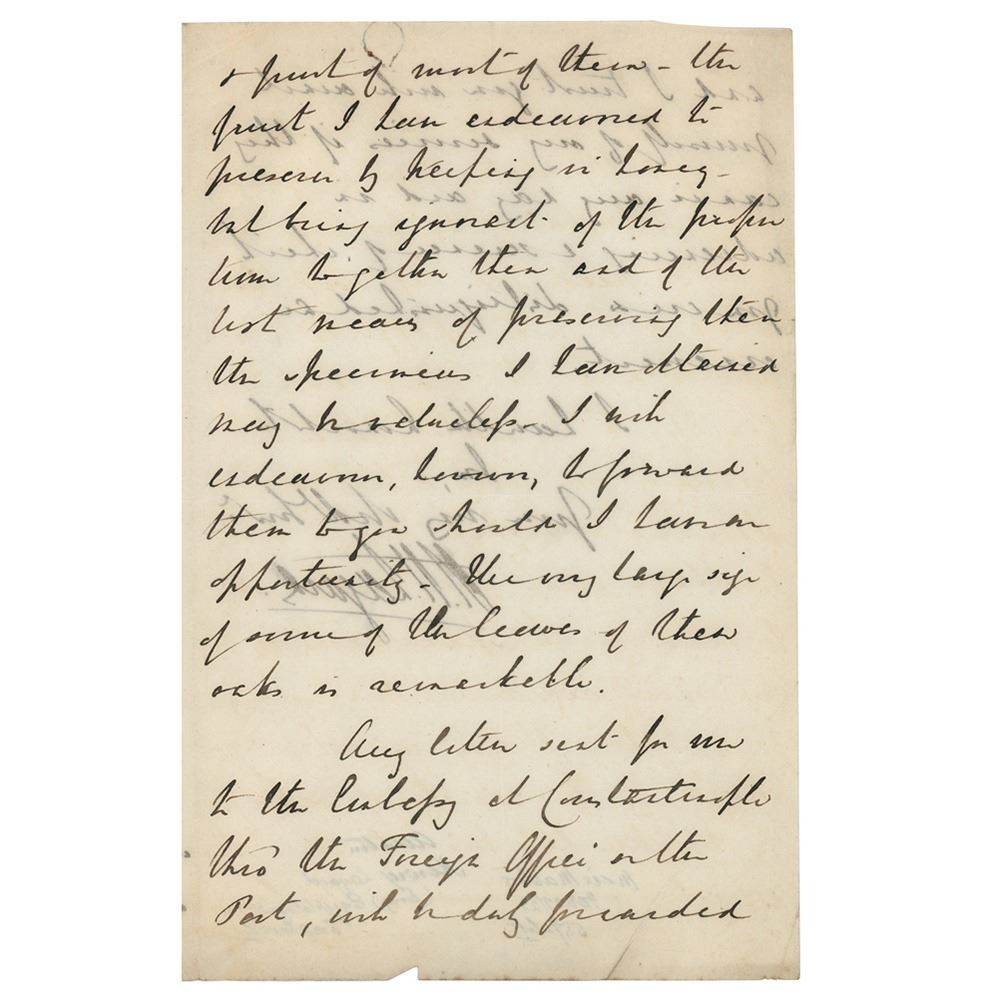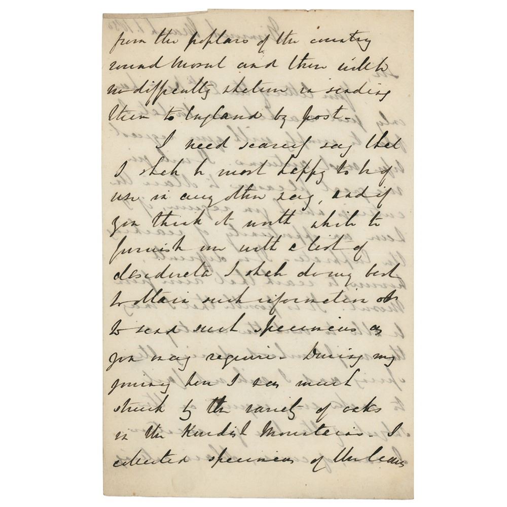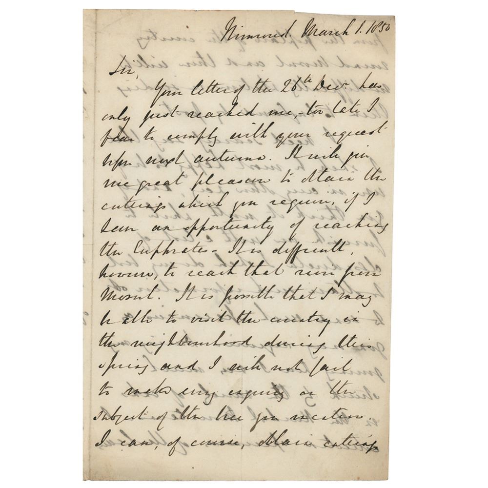British historian and archaeologist (1817-1894) best known as the excavator of Nimrud and Nineveh, where he uncovered a large proportion of the Assyrian palace reliefs. ALS signed “A. H. Layard,†four pages on two adjoining sheets, 5.25 x 8.5, March 1, 1850. Handwritten letter from Nimrud about collecting botanical specimens in the Middle East. In part: "It will give me great pleasure to obtain the cuttings which you require, if I have an opportunity of reaching the Euphrates. It is difficult, however, to reach that ruin from Mosul….I can, of course, obtain cuttings from the poplars of the country round Mosul…During my journey here I was much struck by the variety of oaks in the Kurdish Mountains…The very large size of some of the leaves of these oaks is remarkable." In fine condition, with light creasing and edgewear, and a rusty circular paperclip impression to the top.