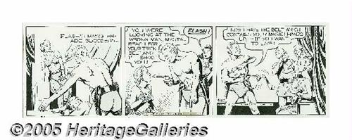 <B>Austin Briggs - Flash Gordon Daily Comic Strip Original Art, dated 4-20-44 (King Features Syndicate, 1944).</B></I> Ever resourceful and experimental, Austin Briggs was a dominant force in illustration. Ghosting for Alex Raymond, Briggs created this daily in 1944, and the art features Flash in every panel! The image area measures 20" x 6," and aside from a glue stain along the bottom of the second panel from a partially-removed copyright paste-up, the art is in Excellent condition.