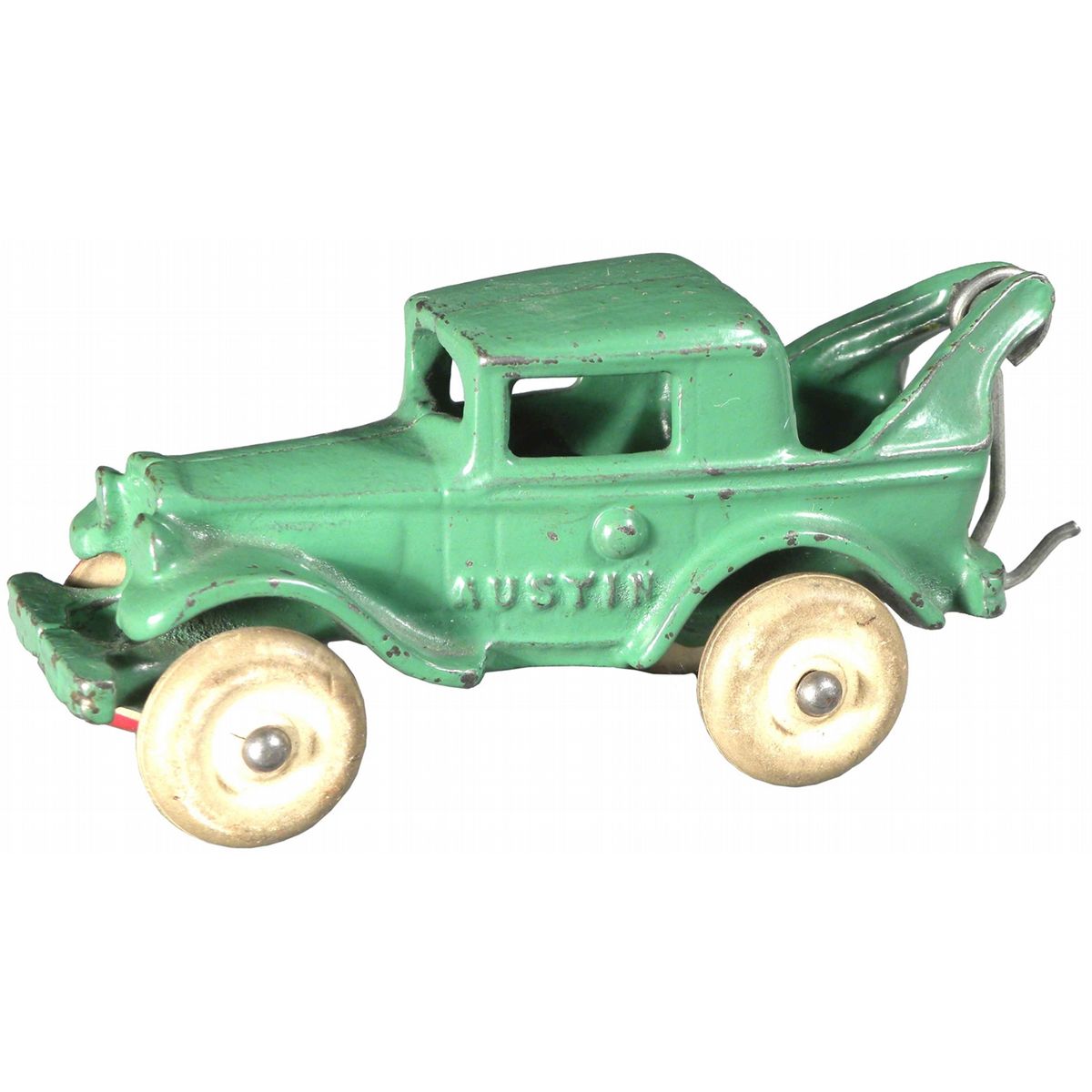 Austin Cast Iron Toy Wrecker, green. Most original paint intact, rubber wheels. Very good condition. 3 3/4 inches long. Start Price $30
