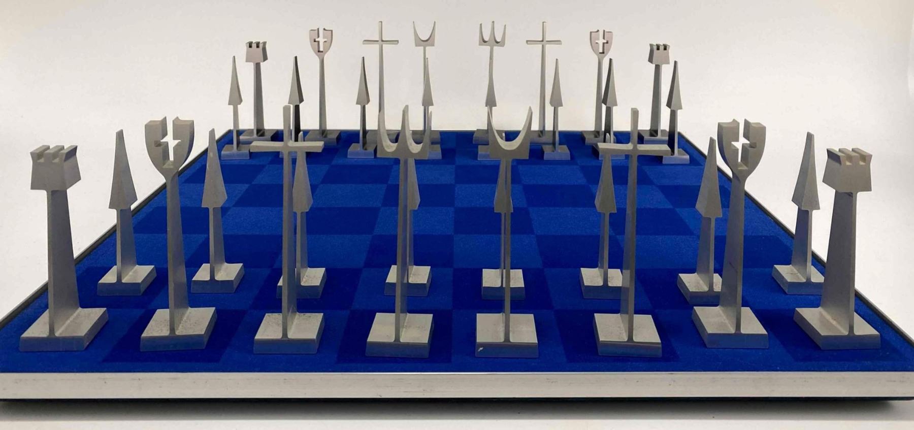 Austin Cox Mid Century Modern Chess Set With Board And Case. Pieces Marked 1962 Austin Enterprises. The surrealist look of the set comes from the metal Gallium. These photos are not enhanced. Pieces Test As Copper, Zinc, And Gallium. They are so lightweight and sleek! Case Approximately 30.75L x 6.0W x 2.25D in. Board Approximately 19.125L x 19.125W in. Largest Piece Approximately 4.875H x 1.25W x 1.25D in. Smallest Piece Approximately 3.75H x 1.0W x 1.0D in.