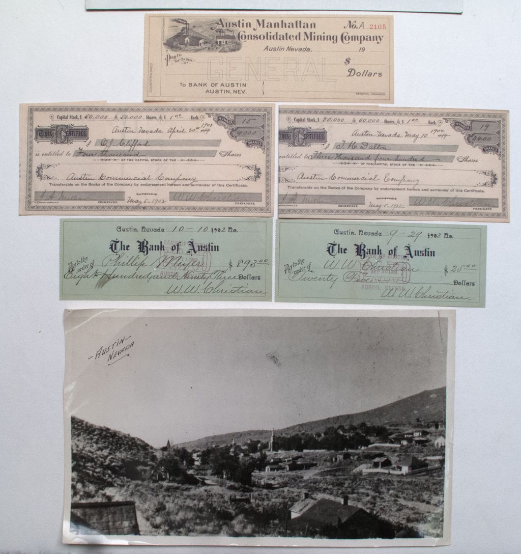 Lot of 6 pieces. Included are a 8.5 x 14” photo reproduction of the town, two 1902 checks on the Bank of Austin, one Austin Manhattan Consolidated Mining Company blank check, and two stock certificates, #s 15 & 19, of the Austin Commercial Company, issued in 1903 and 1904 for 4000 and 3400 shares respectively, and signed by W.W. Christian, President.City: AustinCounty: Lander CountyState: NV