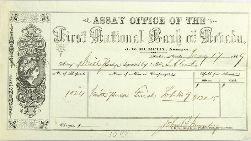 No.1024 Assay certificate for mill pulp deposited by the Manhattan Silver Mining Co. through their agent Alan Curtis, also an officer of this bank. This form was printed by J.D. Fairchild & Co., of the Daily Reveille Office, and signed by John R. Murphy, Assayer. There is a detailed ornate vignette of a side view of lady liberty on the left side. Think black border and old English title script. Overall value of the silver in the assayed pulp was an estimated $120.05. The reverse is signed by John R. Murphy and dated May 17, 1867. Fine condition.