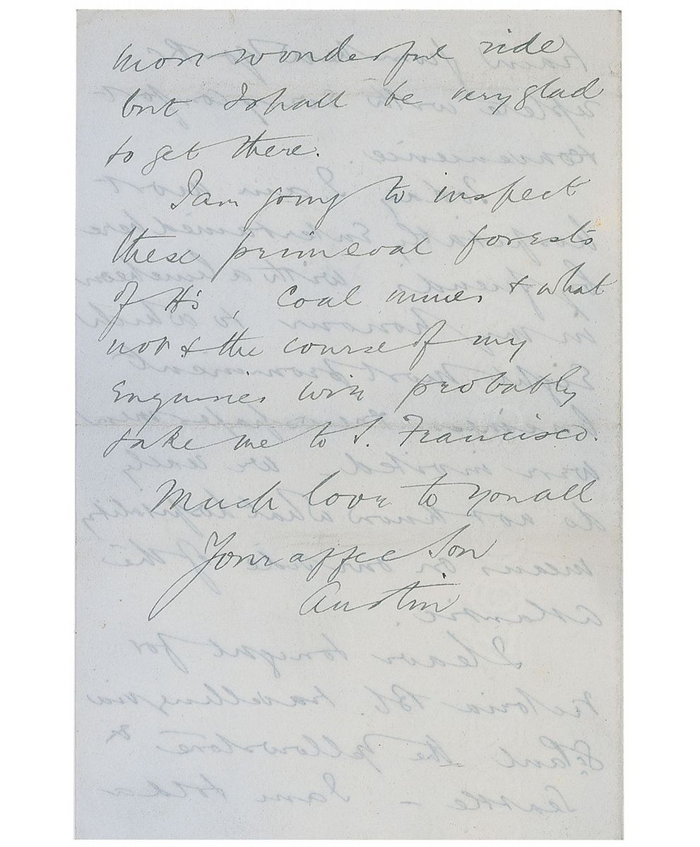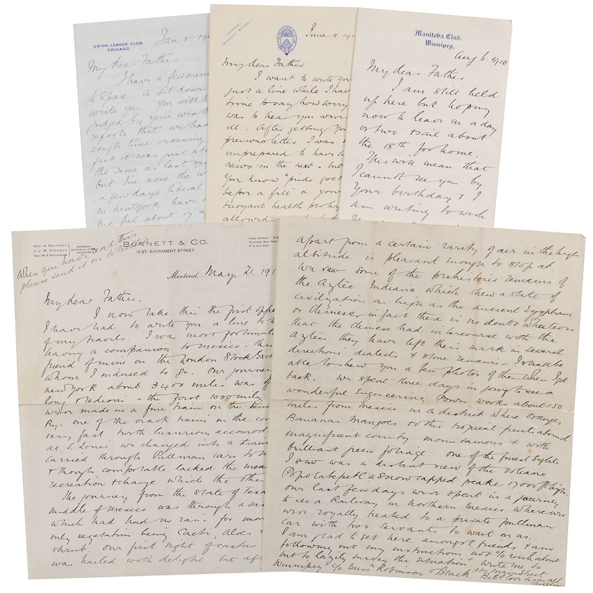 A successful stockbroker in both England and Canada (1871-1912), Partner lost his life when the Titanic sank. Collection of four multi-page ALSs, all signed “Austin,” three 4.5 x 7, and one 9 x 10.25, on various letterhead, dating from 1909–1910, all written to his father. One letter, dated January 8, 1909, reads, in part: “You will have judged by your weather reports that we had a rough time crossing—in fact it was just about the same as last year but I’m none the worse—a few days liberal table in New York have made me feel 17 again & fit for any amount of work.” A later letter, dated May 21, 1910, details his travels to Mexico. In part: “I was most fortunate in having a companion to Mexico. This was a friend of mine on the London Stock Exchange whom I induced to go. Our journey from New York about 3400 miles was of course long & tedious…On our way down we stopped at Monterey…where there were such disastrous floods last year upwards of 4000 homes being swept away with 1000 lives lost.” In overall fine condition, with some light toning to larger letter. Ex. Brian Green Collection.