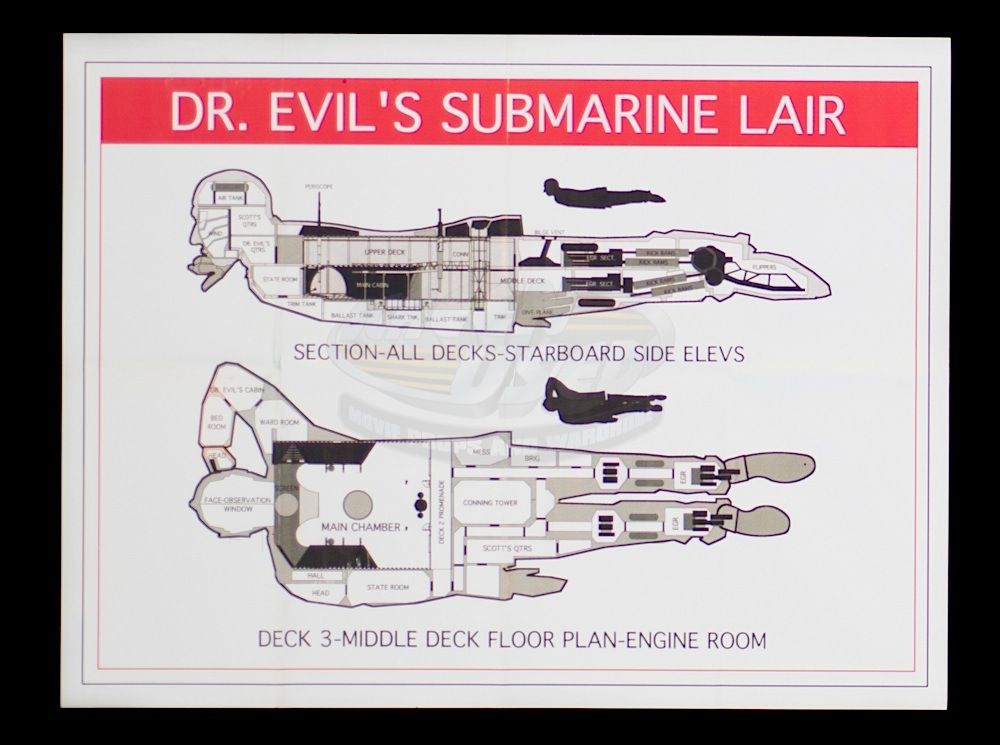 (New Line, 2002) This prop map was custom-printed for the production and can be seen when Austin Powers (Mike Myers), Mini-Me (Verne Troyer) and Foxxy Cleopatra (Beyonce) infiltrate Dr. Evil's submarine lair. The map features the complete layout of the submarine lair and measures 19.5" wide x 15" tall.