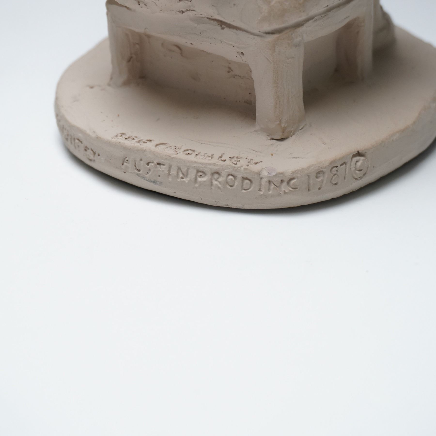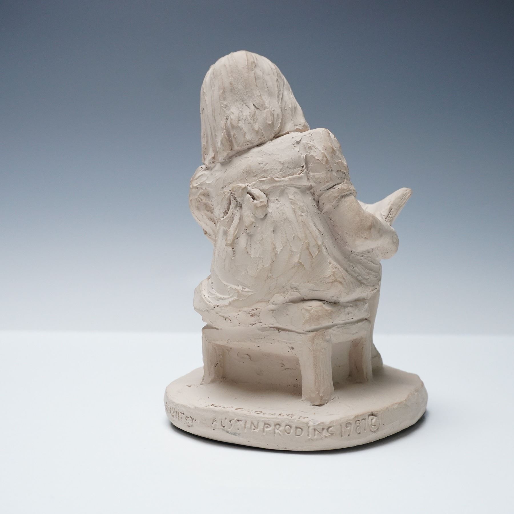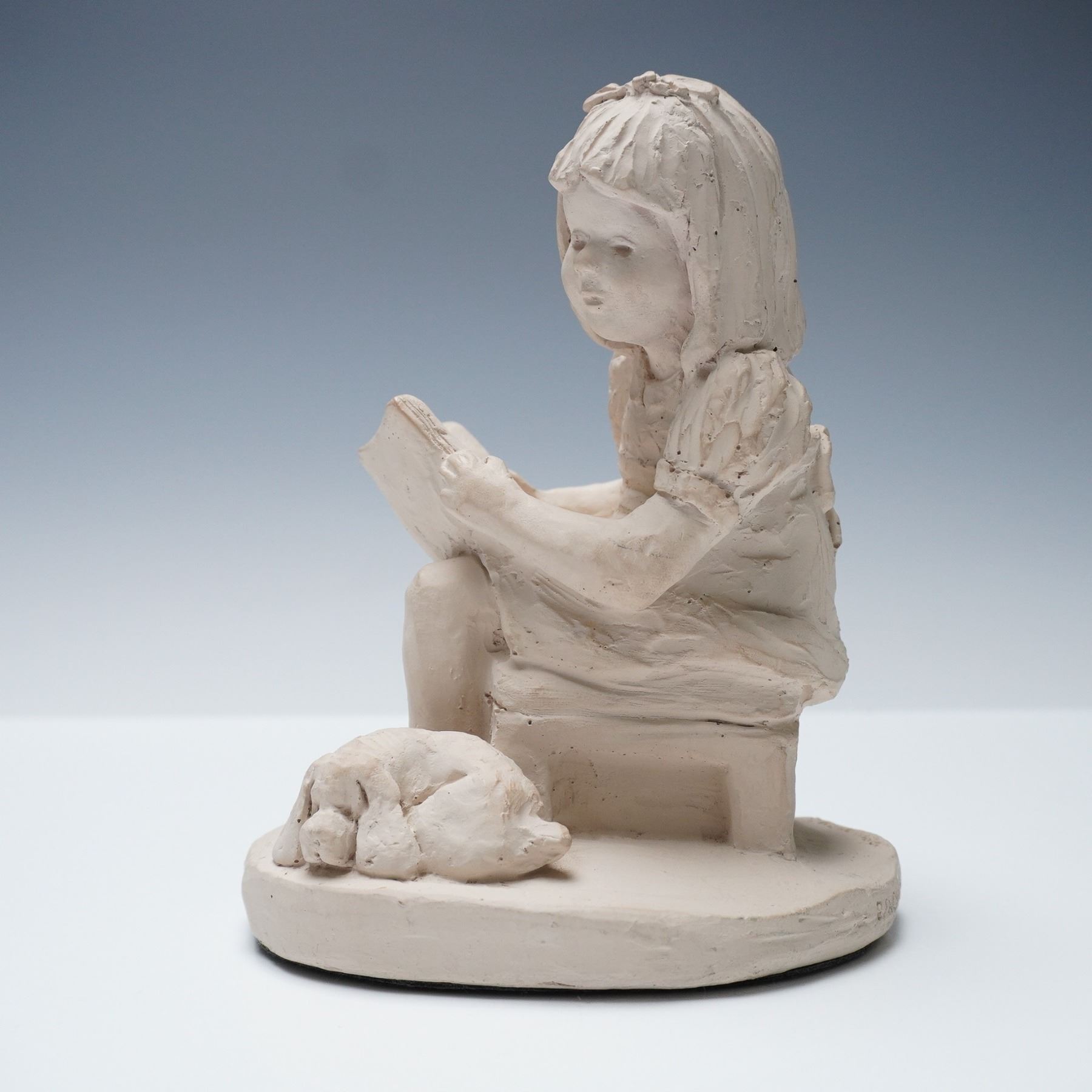 A sweet and nostalgic Austin Sculpture piece by artist Dee Crowley, dated 1987, titled Little Reader. The sculpture captures a young girl seated on a small bench, deeply absorbed in a book with a sleeping puppy at her feet. Rendered in Austin's signature ivory-tone plaster finish, the piece showcases Crowley's expressive style and attention to childhood detail. Marked on the base with artist name, copyright date, and Austin Prod Inc. Measures approx. 6.75"H.