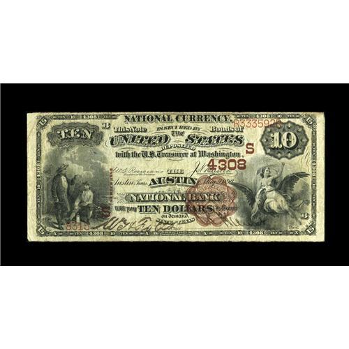 <B>Austin, TX</B></I> - $10 1882 Brown Back Fr. 484 <B>The Austin NB</B></I> Ch. # (S)4308<BR>This is one of nine Brown Backs reported from this much in demand state capital bank, of which a full third are forever ensconced in the Philpott/Moody Foundation holdings. It's a problem free example with excellent color and great eye appeal, and one which is certain to please. Nice <B>Fine+.</B></I><BR><BR><b>Shipping:</b> Coin/Currency (<a target="_blank" href="http://www.heritageauctions.com/common/shipping.php">view shipping information</a>)