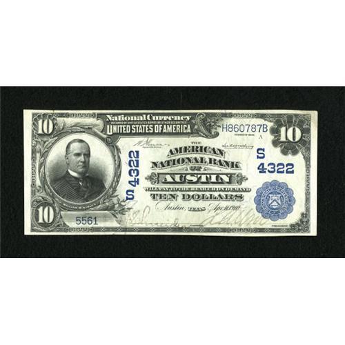 <B>Austin, TX</B></I> - $10 1902 Date Back Fr. 619 <B>The American NB</B></I> Ch. # (S)4322<BR> A lovely example which is the only $10 Date Back reported from here to date. With the exception of a trio of notes in the Moody Foundation holdings, it's also the finest Third Charter example of any kind in the census. Bright <B>Extremely Fine,</B></I> with considerable original embossing remaining.<BR><BR><b>Shipping:</b> Coins & Currency (<a target="_blank" href="http://www.heritageauctions.com/common/shipping.php">view shipping information</a>)