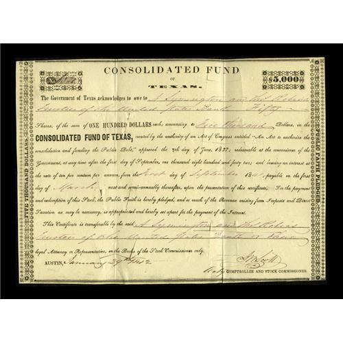Austin, TX- Consolidated Fund of Texas $5000 Bond 1837