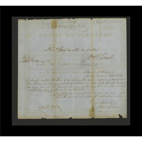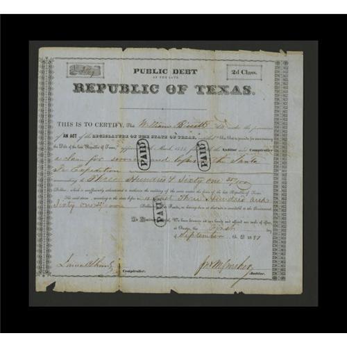 <B>Austin, TX- Public Debt of the Late Republic of Texas Second Class</B></I> $361.25 Sep. 1, 1851<BR>William Bissett was paid for his Santa Fe Campaign services with this document. Then in 1861 Mr. Bissett's father submitted it for payment. At this point it was rubber stamped "Paid" three times. There is edge wear and some separation at the folds. A couple of older stamp hinges have been used for repairs. <B>Fine.</B></I>
