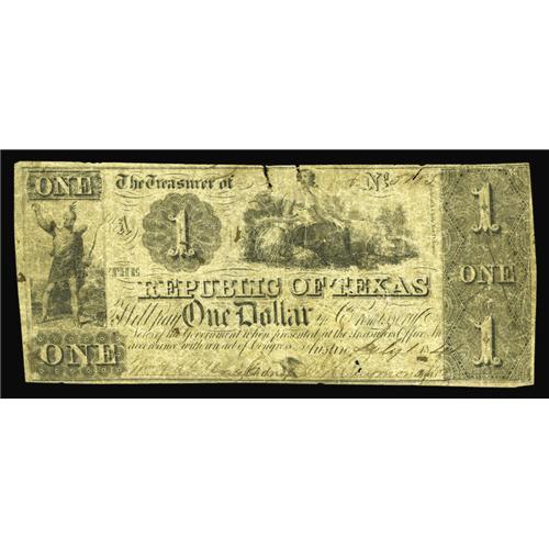 <B>Austin, TX- Republic of Texas</B></I> $1 July 1, 1841 Criswell A1 Medlar 21<BR>This note has not been cut cancelled and that in itself makes this a special note for this issue. It does show ink erosion and other holes. Still extremely rare without the usual cut cancels. <B>Very Good-Fine.</B></I>