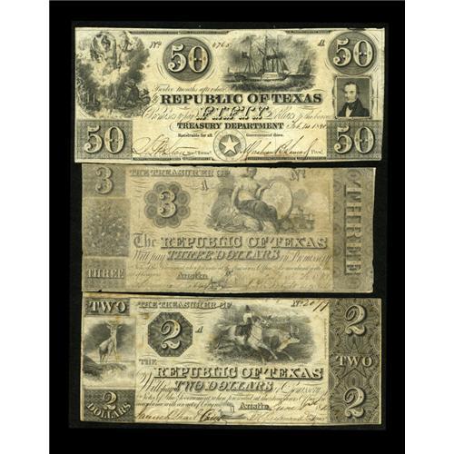 <B>Austin, TX- Republic of Texas</B></I> $2; $3; $50 1840-41 Criswell A2; A3; A27 Medlar 22; 23; 27<BR>The $2 grades <B>VF,</B></I> with repaired cut cancels; the $3 grades <B>VG,</B></I> CC; and the $50 grades <B>VF+,</B></I> CC.