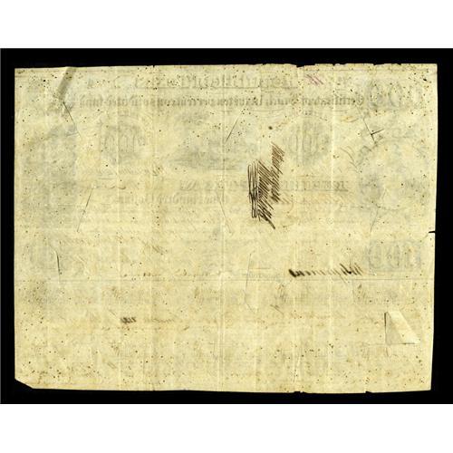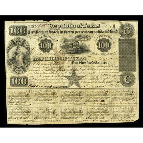 <B>Austin, TX- Republic of Texas Consolidated Fund Certificate</B></I> $100 June 15, 1840 Medlar UNL<BR>This "Certificate of Stock in the ten per cent consolidated fund" has numerous ink flyspecks on the back. This example is signed and numbered. <B>Very Fine,</B></I> CC.<BR><BR><b>Shipping:</b> Coins & Currency (<a target="_blank" href="http://www.heritageauctions.com/common/shipping.php">view shipping information</a>)