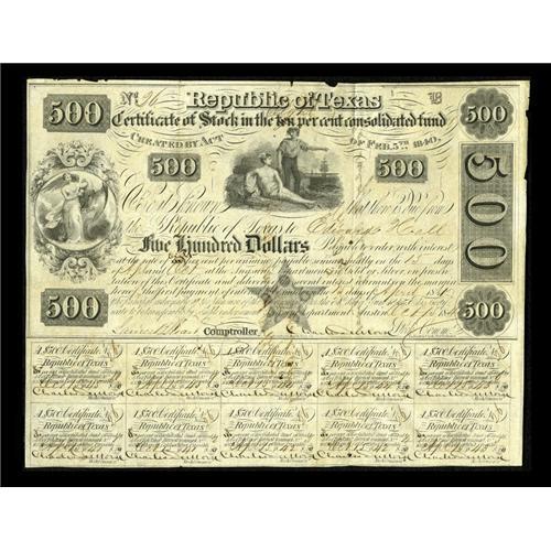 <B>Austin, TX- Republic of Texas Consolidated Fund Certificate</B></I> $500 June 15, 1840 Medlar UNL<BR>This "Certificate of Stock in the ten per cent consolidated fund" has been revalued at eight per cent. Penned statements to this effect have been added to the back. This example has not been cut cancelled, but a little bit of ink erosion is noticed. The $500 denomination from this issue is scarcer than the $100 denomination. <B>Extremely Fine-About Uncirculated.</B></I><BR><BR><b>Shipping:</b> Coins & Currency (<a target="_blank" href="http://www.heritageauctions.com/common/shipping.php">view shipping information</a>)