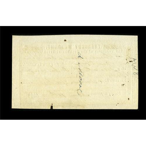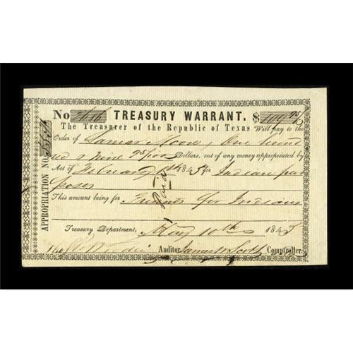<B>Austin, TX- Republic of Texas Fifth Issue of Warrants </B></I>$109.95 May 10, 1845 Cr. AW8, Medlar 14, Olson 880<BR> This warrant carries an interesting description for the use of the requested funds, "This amount being for Presents for Indians". Texas was still a wild and open country during this time, and, due to Sam Houston's policies of working with them, versus killing them, many tribes had entered into treaties promising to end hostilities towards whites. Tribes such as the Cherokee, Waco, Tawakoni, Kichais, Anadarkos, Delaware, Caddo, Shawnee, Biloxi, agreed initially to end hostilities, while the Comanches and Wichita were the last two tribes to enter into treaties with the Republic in 1845. While Sam Houston tried to work with the Natives, the next president, Lamar, simply wanted to drive all Natives from the lands, and, this is reflected in the monies spent on Indian Affairs. During Houston's first term, $190,000 was spent on Indian Affairs, versus $2.5 Million spent during Lamar's term. When Houston once again became president after Lamar, his administration spent $94,000 which is a reflection of the number of treaties signed between the Natives and the Texian's. This warrant grades <B>Choice About Uncirculated </B></I>due to a couple of corner folds. <BR><BR><b>Shipping:</b> Coins & Currency (<a target="_blank" href="http://www.heritageauctions.com/common/shipping.php">view shipping information</a>)