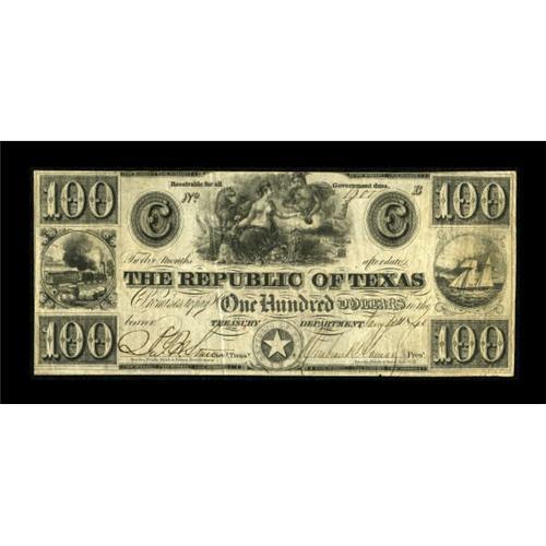 <B>Austin, TX- Republic of Texas Fifth Issue of Notes</B></I> $100 Jan 1, 1840 Cr. A8, Medlar 28, Olson 769<BR> A spectacular Texas $100 with impressive eye appeal, issued on New Year's Day, 1840. This denomination is one of the less seen notes in this series, and although not as scarce as the $500, is beginning to disappear from the marketplace as they are not readily available. <B>Very Fine</B></I>, CC.<BR><BR><b>Shipping:</b> Coins & Currency (<a target="_blank" href="http://www.heritageauctions.com/common/shipping.php">view shipping information</a>)