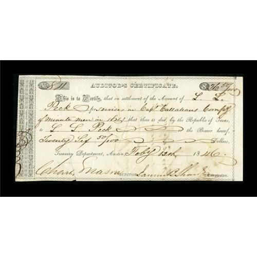 <B>Austin, TX- Republic of Texas Fifth Issue of Warrants</B></I> $26.50 Feb 13, 1846 Cr. AW10, Medlar 13, Olson 930<BR> Auditor's Certificate used for back pay to L.L. Peck for service as a minutemen in Captain Callahan's Company in 1841. The minutemen were used to fight Native Americans and Mexicans, usually suspected of stealing horses. <B>About Uncirculated</B></I>, CC.<BR><BR><b>Shipping:</b> Coins & Currency (<a target="_blank" href="http://www.heritageauctions.com/common/shipping.php">view shipping information</a>)