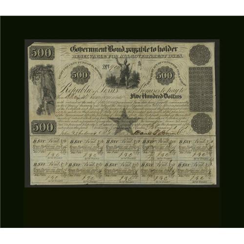 <B>Austin, TX- Republic of Texas Government Certificate of Stock Bond</B></I> $500 Feb. 1, 1841 Medlar UNL<BR>This ten percent coupon bond has ten remaining coupons. The upper left-hand corner tip is missing from this <B>Very Fine,</B></I> CC example.