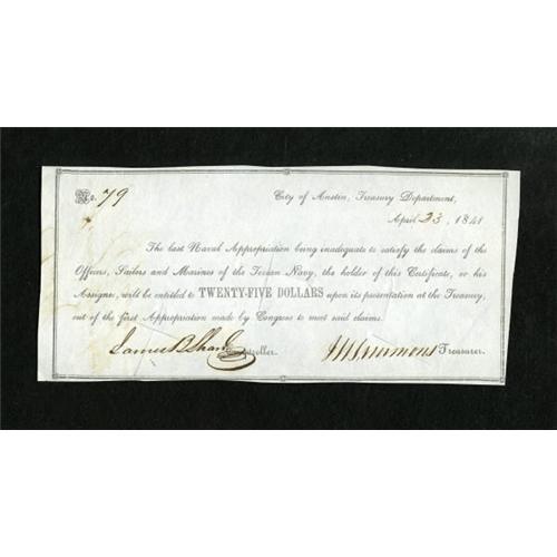 <B>Austin, TX- Republic of Texas Naval Appropriation Warrant</B></I> $25 Apr. 23, 1841 Criswell AW3 Medlar 44 <BR> Naval Appropriation Certificates were actually used for the second Texian Navy after the first had lost all four of its ships by 1837 due to war and Mother Nature. Commodore Edwin Moore was the chief officer of the navy. He and Sam Houston had different naval policies which led to the necessary use of these certificates to pay the men of the Texian Navy. This note is nicely embossed and fully framed. <B>Choice About Uncirculated, </B></I>CC.<BR><BR><b>Shipping:</b> Coins & Currency (<a target="_blank" href="http://www.heritageauctions.com/common/shipping.php">view shipping information</a>)