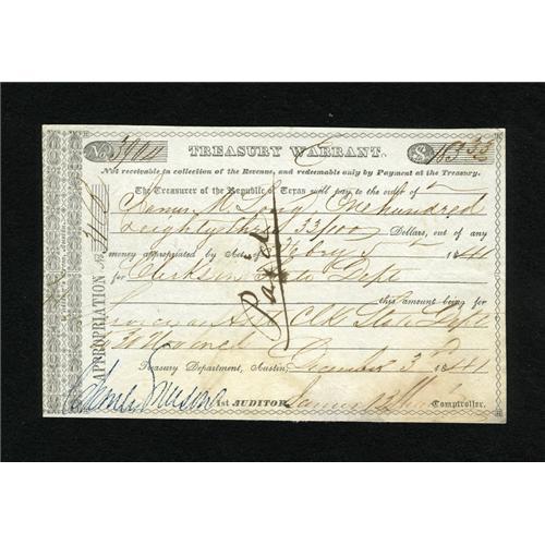 <B>Austin, TX - Republic of Texas Treasury Warrant</B></I> $183.33 Dec. 3, 1841 Cr. AW5 Medlar 5<BR>This is an extremely rare variety, with the imprint reading, "Whiting's Press, Austin." <B>Very Fine-Extremely Fine,</B></I> pen cancelled and with a light stain in the lower right corner.<BR><BR><b>Shipping:</b> Coins & Currency (<a target="_blank" href="http://www.heritageauctions.com/common/shipping.php">view shipping information</a>)