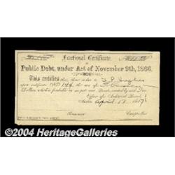 Austin, TX - State of Texas Fractional Certificate of Public Debt $11.00 Apr. 17, 1867 UNLThis scarce item is unlisted in Medlar and is the first that we can remember having seen. Crisp Uncirculated, unsigned but likely to see spirited bidding by collectors from this heavily collected state. <BR><BR><B>Important notice:</B> Heritage usually auctions material at the rate of 200-250 lots per hour. On some occasions eBay Live bid software or the Internet may not be able to keep up with the pace of the auction. We recommend placing a realistic absentee bid now as insurance to avoid disappointment. Occasionally the auctioneer may eliminate or reject an eBay Live bid, and the auctioneer may also reopen a lot after the close of the eBay live bidding (usually because we missed an audience bid), and may reject your bid even if it shows you as the winning bidder. By bidding via eBay Live, you agree that Heritage may award the lot to another bidder at its sole discretion under the circumstances described above or any other reasonable circumstances. Since eBay bids are not shown to us until we open the lot on the floor, we treat those bids just like floor bids. In most cases the floor responds before the eBay bid is presented to us, due to Internet lag time, so for consistency we have made it a policy that floor bids are always considered first over tie eBay live bids. Also please note that all Heritage lots purchased through eBay Live carry a 20% Buyer's Premium. Please make sure you read the Terms and Conditions before you bid. <BR><BR><B>IMPORTANT ANNOUNCEMENT ABOUT RESERVES:</B> Heritage now divulges all reserves on its web site 7 days before every auction. If you want to know whether the reserve on this lot has been met, and if not, what the reserve amount is, please visit this lot page on the HeritageCoin.com web site, or email: bid@HeritageGalleries.com