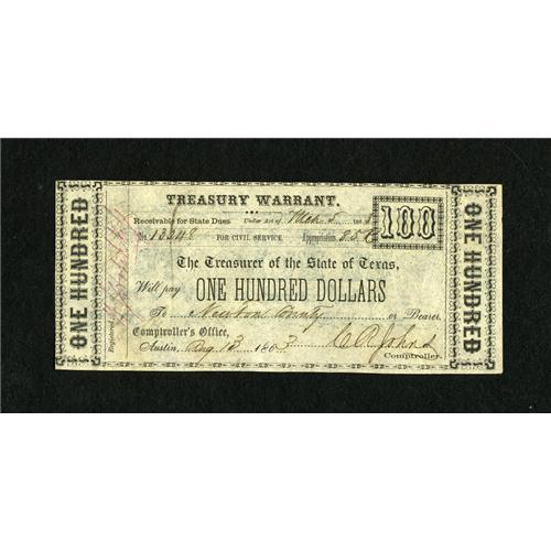 Austin, TX- State of Texas Treasury Warrant$100