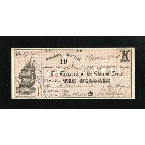 <B>Austin, TX- State of Texas Treasury Warrant </B></I>$10 Jan. 14, 1862 Criswell TW17 Medlar 110 <BR> This is a well preserved warrant. <B>Choice Crisp Uncirculated.<BR></B></I><BR><BR><b>Shipping:</b> Coins & Currency (<a target="_blank" href="http://www.heritageauctions.com/common/shipping.php">view shipping information</a>)