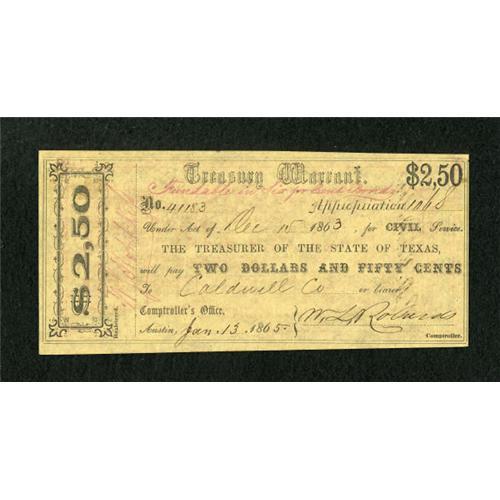 <B>Austin, TX- Treasurer of the State of Texas</B></I> $2.50 Dec. 15, 1863 Cr. TW8 Medlar 104<BR> This is a better variety that has added in red ink below "Treasury Warrant" the following - "Fundable in Six per cent Bonds." We have had this variety only once before. <B>Choice Crisp Uncirculated</B></I>.<BR><BR><b>Shipping:</b> Coins & Currency (<a target="_blank" href="http://www.heritageauctions.com/common/shipping.php">view shipping information</a>)
