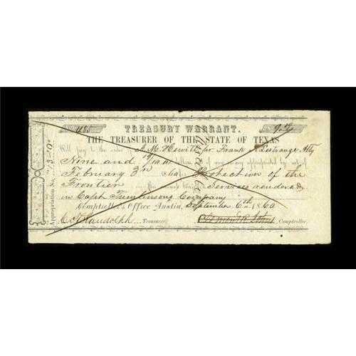 <B>Austin, TX- Treasury Warrant</B></I> $9.19 Sep. 6, 1860 Cr. AW16 Medlar Medlar UNL Olson 1540<BR> This <B>Very Fine </B></I>warrant has the actual "Sam Houston" signature on its back. This example has been pen cancelled. <B>Very Fine.</B></I><BR><BR><b>Shipping:</b> Coins & Currency (<a target="_blank" href="http://www.heritageauctions.com/common/shipping.php">view shipping information</a>)