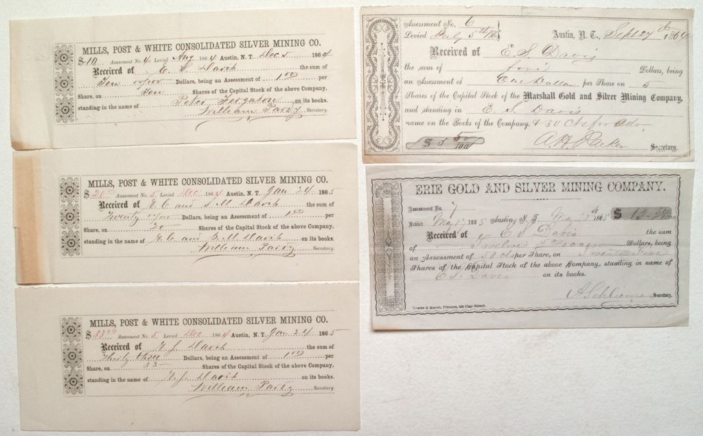 VERY EARLY NEVADA! Two territorial and three first year of statehood. Three are from the Mills, Post & White Consolidated Silver Mining Co., and one each from the Marshall Gold and Silver Mining Company and the Erie Gold and Silver Mining Company. Approximately 3.5 x 7.”