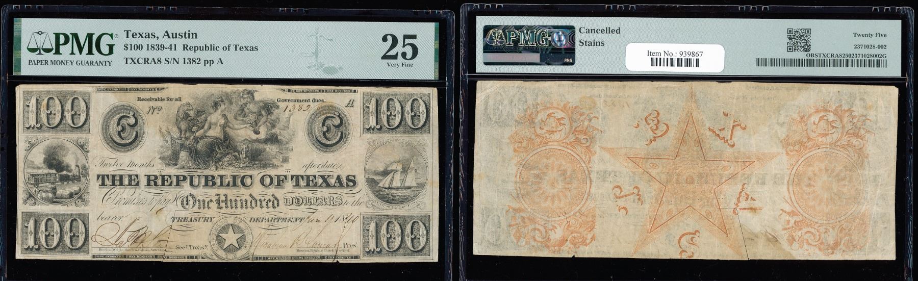 Austin, Texas - Republic Of Texas, Jan. 1, 1840 $100 Cr. A8 Medlar 28 PMG Very Fine 25,