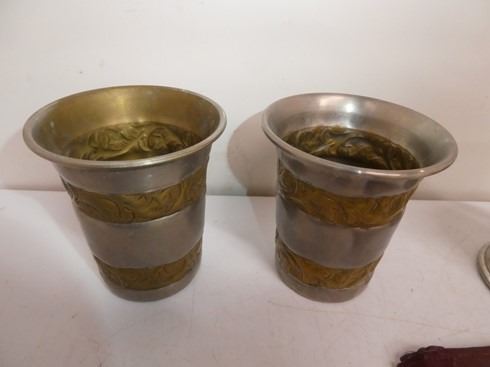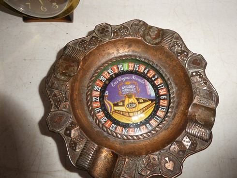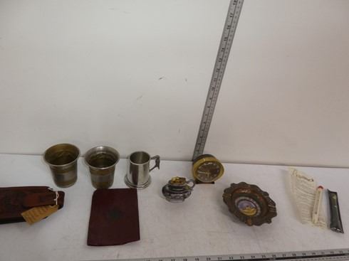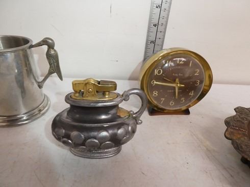 antique pewter cups, vintage lighter, table clock, las vegas ash tray, vintage roller route map measure tool