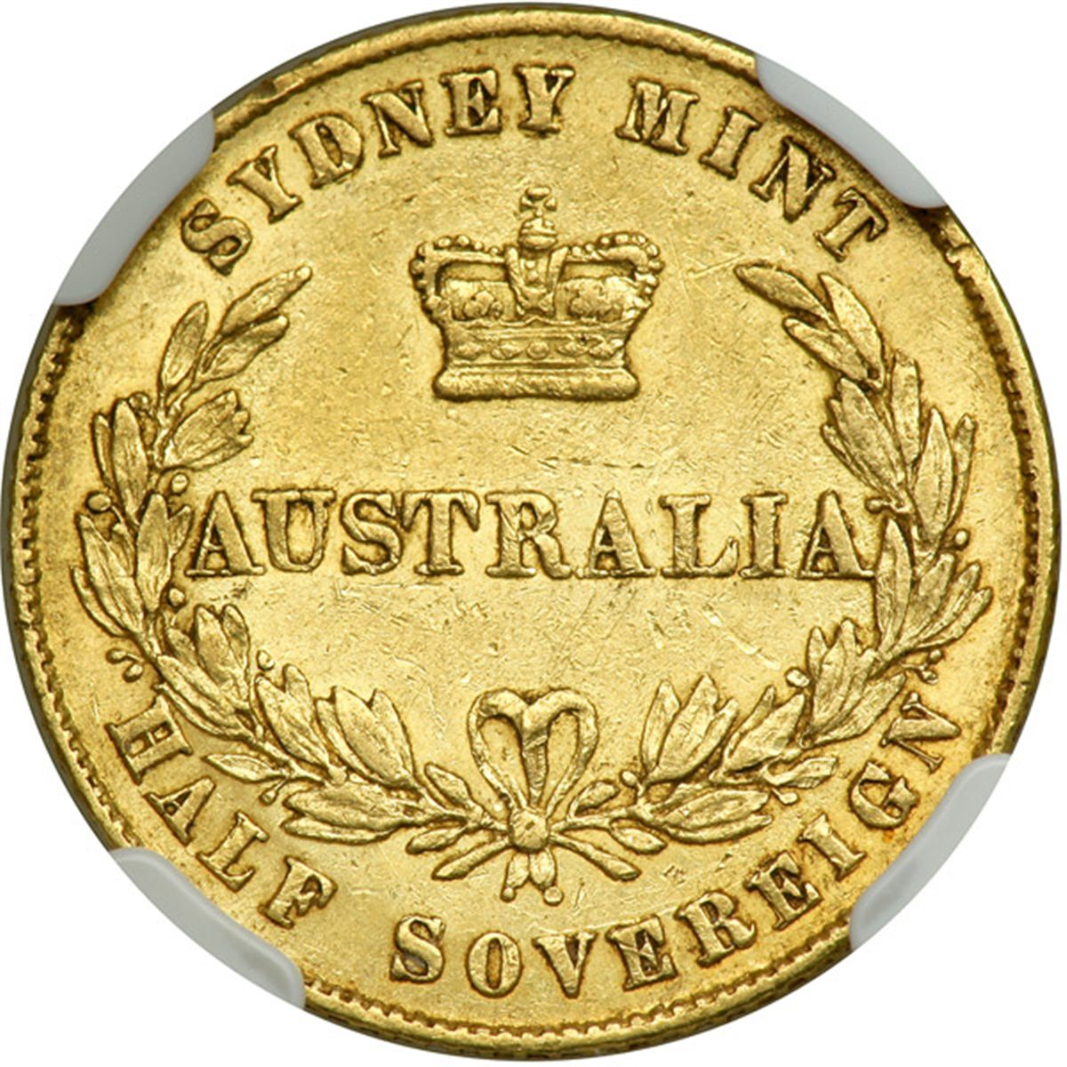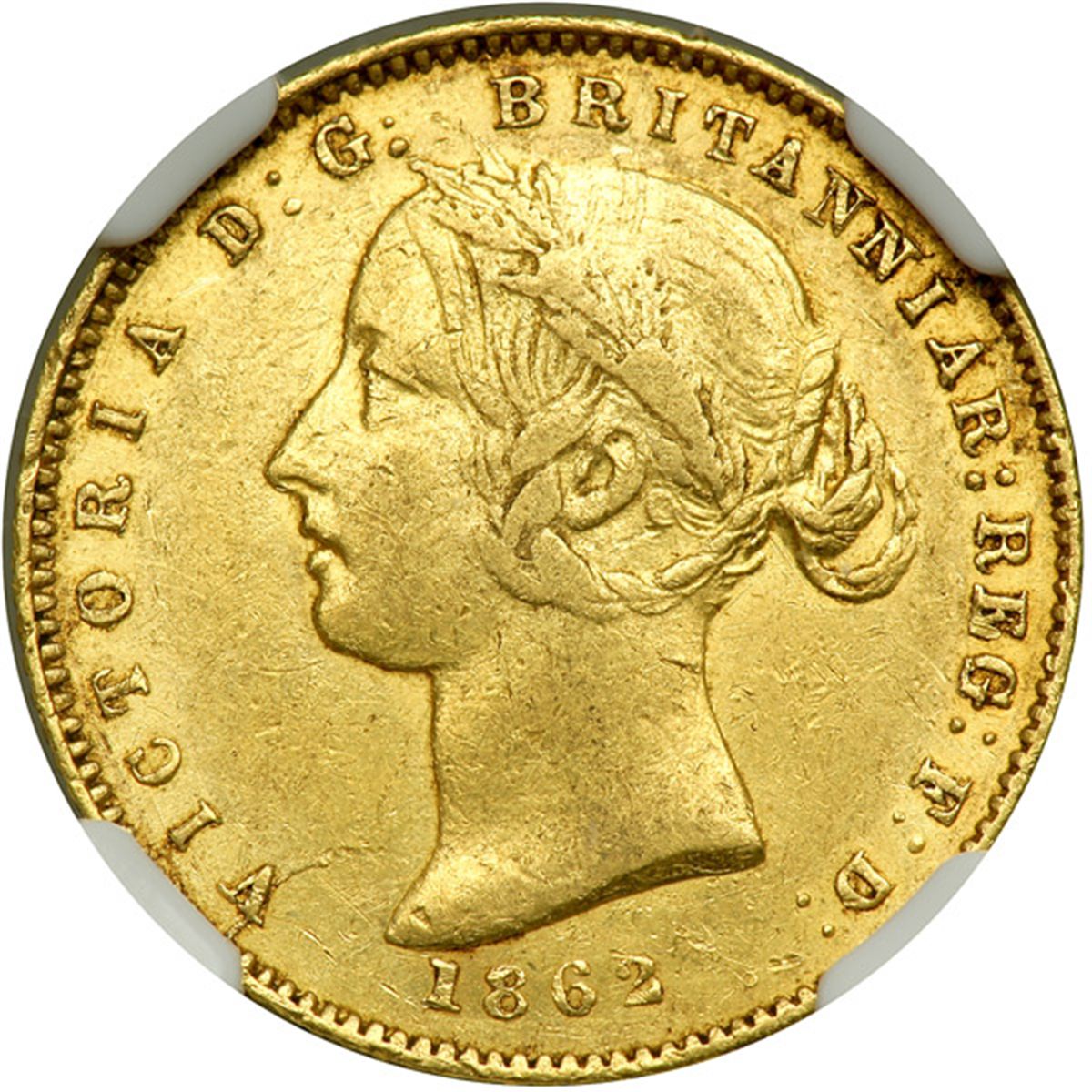 Australia. ½ Sovereign, 1862 (Sydney). Fr-10a; KM-3. Victoria. Young head with hair tie. Reverse: Crown above AUSTRALIA within wreath. NGC graded EF-45.
