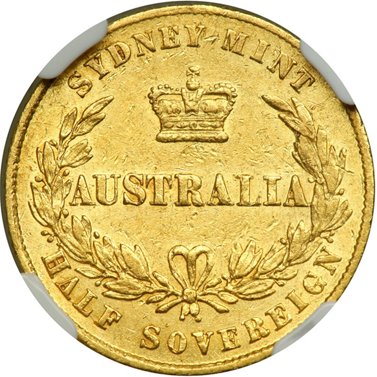 Australia. ½ Sovereign, 1864 (Sydney). Fr-10a; KM-3. Victoria. Young head with hair tie. Reverse: Crown above AUSTRALIA within wreath. NGC graded AU-50.